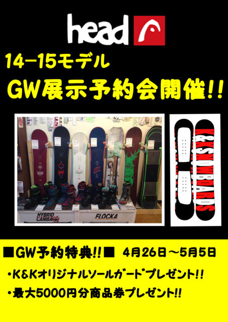 14-15モデルのスノーアイテムの展示予約会開催します!! 期間:4月26日〜5月5日 ■GW予約特典■ ・K&Kオリジナルソールガードプレゼント!! ・最大5000円分の商品券プレゼント!!
