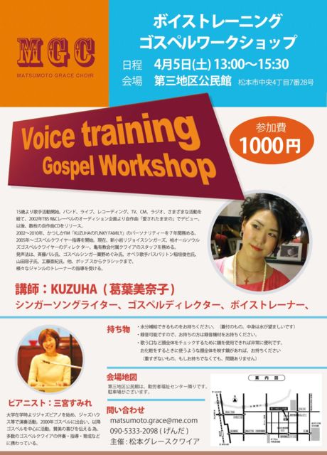 ²Î¤Î¤¿¤á¤Î»ÑÀª¡¢¸ÆµÛ¤½¤·¤Æ·ò¤ä¤«¤ÊȯÀ¼¤Î¤¿¤á¤Î¥È¥ì¡¼¥Ë¥ó¥°¤òÂθ³¡ª ¤½¤·¤Æ¥´¥¹¥Ú¥ë¤â²Î¤Ã¤Á¤ã¤¤¤Þ¤¹¡ª·Ð¸³¼Ô¤Ï¤â¤Á¤í¤ó¡¢½é¿´¼Ô¤âÂç´¿·Þ¤Ç¤¹¡£ ÆüÄø¡§4·î£µÆü¡ÊÅÚ¡Ë13:00~15:30 »²²ÃÈñ¡§1,000±ß ²ñ¡¡¾ì¡§Âè»°ÃÏ¶è¸øÌ±´Û¡Ê¾¾ËÜ»ÔÃæ±û£´ÃúÌÜ£·-£²£¸¡Ë http://www.city.matsumoto.nagano.jp/sisetu/kominkan/daisanntiku.html ¹Ö¡¡»Õ¡§KUZUHA¡Ê³ëÍÕÈþÆà»Ò¡Ë¥Ô¥¢¥Ë¥¹¥È¡§»°µÜ¤¹¤ß¤ì »ý¤Áʪ¡§°ûÎÁ¿å¡¢¤¢¤ì¤ÐÏ¿²»µ¡ºà¤È¼ê¶À¡Ê¸ý¤Î·Á¤Ê¤É¤Î¥Á¥§¥Ã¥¯¤Î¤¿¤á¡Ë Ì䤤¹ç¤ï¤»Àè¡§matsumoto.grace@me.com¡¡090-5333-2098(¤²¤ó¤À) ¹Ö»Õ¾Ò²ð KUZUHA¡Ê