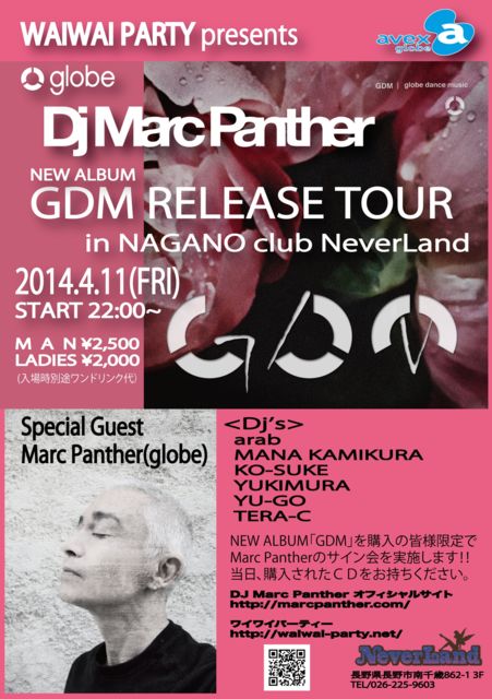 º£½µ¤Î¶âÍËÆü¤Ç¤¹¤è¡¼(^O^)¡¿ ºòǯ£±£±·î¤Ë¥Û¥Æ¥ë¹ñºÝ£²£±¤Ë¤Æ¹Ô¤ï¤ì¤¿¡Ö¥ï¥¤¥ï¥¤¥Ñ¡¼¥Æ¥£¡¼¡×¤Ç¤Î¥¹¥Ú¥·¥ã¥ë¥²¥¹¥È¤Î¥Þ¡¼¥¯¡¦¥Ñ¥ó¥µ¡¼¤¬ºÆ¤ÓĹÌî¤ØÍè¤Þ¤¹¡ª¡ª º£²ó¤ÏNEW ALBUM GDM¤Î¥ê¥ê¡¼¥¹¥Ä¥¢¡¼¤È¤¤¤¦¤³¤È¤Ç¡¢¥¹¥Ú¥·¥ã¥ë¥Ñ¡¼¥Æ¥£¡¼¤ò³«ºÅ¤¤¤¿¤·¤Þ¤¹¡£ ³§¤µ¤óÀ§È󡢤¢¤ÎÀ¹¤ê¾å¤¬¤ê¤ò¤â¤¦°ìÅÙ¡ª¡ª ¤È¤¤¤¦¤³¤È¤Ç¡¢¤´Íè¾ì¤ò¤ªÂÔ¤Á¤·¤Æ¤Þ¤¹¡£ WAIWAI PARTY presents globe Marc Panther GDM RELEASE TOUR in NAGANO club NeverLand 2014.4.11(FRI) start 22:00 @NAGANO club NeverLand ĹÌĹÌî»ÔÆîÀéºÐ862-1 3F TEL/026-225-960