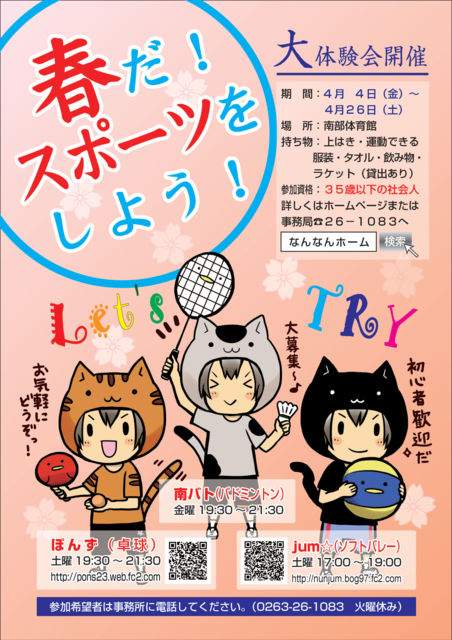 ¾¾ËÜ»Ô¤ÎÆîÉôÂΰé´Û¤Ç³èư¤·¤Æ¤¤¤ë£³¤Ä¤Î¥¹¥Ý¡¼¥Ä¥µ¡¼¥¯¥ë¤ÇÂθ³²ñ¤ò¹Ô¤¤¤Þ¤¹ ¼ïÌܤϥ½¥Õ¥È¥Ð¥ì¡¼¤ÈÂîµå¤È¥Ð¥É¥ß¥ó¥È¥ó¤Ç¡¢´ü´Ö¤Ï4·î4Æü¡Ê¶â¡Ë¡Á4·î26Æü¡ÊÅڡˤǤ¹¡£ Ãç´Ö¤òºî¤Ã¤Æ¤ï¤¤¤ï¤¤³Ú¤·¤¯Í·¤Ó¤¿¤¤ÊýÆüº¢¤Î±¿Æ°ÉÔ¤¬µ¤¤Ë¤Ê¤Ã¤Æ¤¤¤ëÊýÀμè¤Ã¤¿µÏÊÁ¡Ê¤¤Í¤Å¤«¡Ë¤ò¤â¤¦°ìÅÙ¿¶¤Ã¤Æ¤ß¤¿¤¤Êý¤ä²¿¤«¿·¤·¤¤¥¹¥Ý¡¼¥Ä¤Ë¥Á¥ã¥ì¥ó¥¸¤·¤Æ¤ß¤¿¤¤Êý ²¿¤«¤ò¤ä¤ê¤¿¤¤¸µµ¤¤¬¤¢¤ë¿Í¤Ê¤é¥¹¥Ý¡¼¥Ä·Ð¸³¤ÎÍ̵¤Ï´Ø·¸¤¢¤ê¤Þ¤»¤ó ̤·Ð¸³¼Ô¤â·Ð¸³¼Ô¤âÂç´¿·Þ¤Ç¤¹ ´ü´ÖÃæ¤ÎÅԹ礤¤¤Æü¤Ë¤ªµ¤·Ú¤Ë¤´»²²Ã¤¯¤À¤µ¤¤¢ö ¥Ð¥É¥ß¥ó