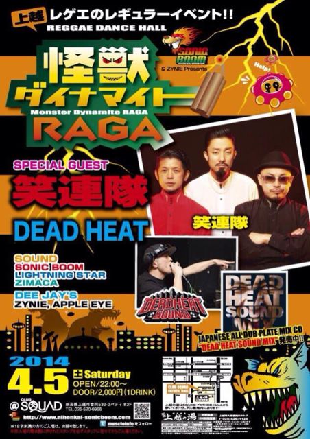 REGGAE DANCEHALL ²ø½Ã¥À¥¤¥Ê¥Þ¥¤¥È£Ò£ÁGA ¡ÚSPECIAL GUEST¡Û ¾ÐÏ¢Ââ from TOKYO DEAD HEAT from YOKOSUKA ¡ÚSOUND¡Û SONIC BOOM LIGHTNING STAR ZIMACA ¡ÚDEEJAY¡Û ZYNIE APPLE EYE ¡ÚÆü»þ¡Û £´·î£µÆüÅÚÍËÆü £Ï£Ð£Å£Î £²£²¡§£°£° ¡ÚÆþ¾ìÎÁ¡Û ¡ï2,000 (1¥É¥ê¥ó¥¯ÉÕ) ¡Ú¾ì½ê¡Û ¿·³ã¸©¾å±Û»Ô¥Ñ¥Æ¥£¥ªÆó³¬ [CLUB SQUAD] ¡ÚÌ䤤¹ç¤ï¤»¡Û [CLUB SQUAD] 025-520-6966 ¤½¤Î¾¾Ü¤·¤¤¾ðÊó¤Ï¡ª http://nihonkai-sonicboom.com/ http://hp30.0zero.jp/570/MUSCLEMAX/