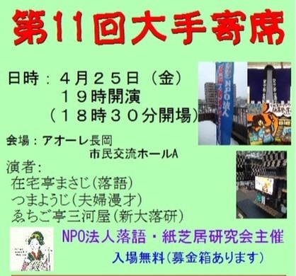 4·î25Æü¶âÍËÆü19»þ³«±é¡ÖÂè11²óÂç¼ê´óÀʡפǤ¹¡£ ²ñ¾ì¤Ï¡¢¥¢¥ª¡¼¥ìĹ²¬»Ô̱¸òή¥Û¡¼¥ëA (Äê°÷200¿Í) JRĹ²¬±Ø¤«¤éÅÌÊ⣲ʬ¡£ÊâÆ»¶¶¤Ç·Ò¤¬¤Ã¤Æ¤¤¤ë¤Î¤Ç¡¢±«¤Ç¤âǨ¤ì¤Þ¤»¤ó¡£ »ÔÌò½ê¤âÆþ¤Ã¤Æ¤¤¤Þ¤¹¡£ £Î£Ð£ÏË¡¿ÍÍî¸ì¡¦»æ¼Çµï¸¦µæ²ñ¼çºÅ¡£ http://raku-kami.com (¸ø¼°¥Û¡¼¥à¥Ú¡¼¥¸) ½Ð±é¡¢ºßÂðÄâ¤Þ¤µ¤¸(Íî¸ì) ¤Ä¤Þ¤è¤¦¤¸(É×ÉØÌ¡ºÍ) ¤ñ¤Á¤´Äâ»°²Ï²°(¿·ÂçÍ) Æþ¾ì̵ÎÁ(Êç¶âÈ¢¤¢¤ê¤Þ¤¹) Ĺ²¬»ÔÀ¯¤À¤è¤ê¤Ë¤ª¤ê¹þ¤Þ¤ì¤ë¥¢¥ª¡¼¥ìĹ²¬¤Î¥¤¥Ù¥ó¥È¥«¥ì¥ó¥À¡¼¤Ë¡ÖÂè11²óÂç¼ê´óÀʡפ¬ºÜ¤ê¤Þ¤·¤¿¡£ ¼õÉÕ¡¢²ñ¾ìÀ°Íý¡¢²»¶Á¡¢¾ÈÌÀ¤Ê
