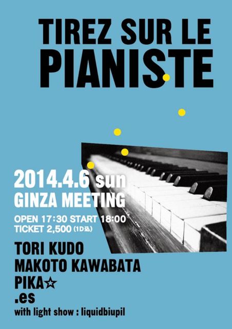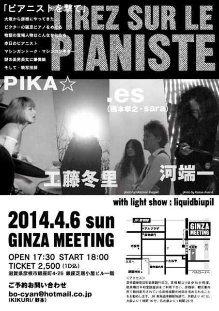 彦根に寄贈されたピアノのお披露目ライヴ! 工藤冬里+河端一、.es +PIKA☆の二組にliquidbiupil が光を放つ! 4/6(日) 『ピアニストを撃て』 @GINZA MEETING (滋賀県彦根市銀座町4−26 銀座芝居小屋ビル一階) open 17:30/ start 18:00 2500円(1DRINK付き) 大阪から彦根にやってきたビクターの猫足ピアノに纏わる物語 登場人物はこんなひとたち 本日のピアニスト マシンガントーク・マシンガンギター 謎の美男美女に爆弾娘 そして映写技師 工藤冬里 河端一 .es(橋本孝之・sara) PIKA☆ light s