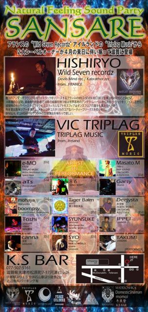 年明けの新年会Partyから少し間が空きましたがSANSAREの次回の開催は4/19(土)になります!!! そして嬉しいお知らせもあります☆ この日は フランスの“Wild Seven Recordz" よりHISHIRYO アイルランドの“Triplag Music"よりVIC TRIPLAG とそれぞれのレーベルオーナーでもある2人が4月の来日に伴いSANSAREにも参加してくれる事になりました!!! その他にもかっこいいDJがいっぱい出演します^^ 是非遊びに来てね☆ 2014.4.19(SAT) Natural Feeling Sound Party SANSARE vol.34 〜HISHIRYO & VIC TRIPLAG Japan T