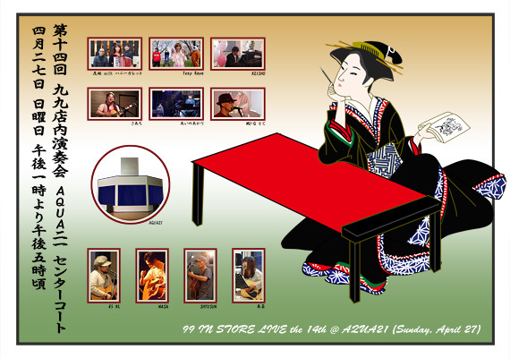 フライヤの拡大 → http://99live.jp/history/aqua21_2014_04_l.jpg ☆99 IN STORE LIVE the 14th @ AQUA21 (Sunday, April 27) 「第14回 99インストアライブ」@AQUA21 [date] 4月27日 (日) [start] 13:00〜17:00頃(☆午後1時スタートです) [place] AQUA21 センターコート [act] Tony Reve,SHYUSUN,奏菜,KEISHO,MASA,あいのあかり,さあち,花林 with ハニーガレット,MU-G とく,彩 紋 99ライブHP → http://99live.jp/ 携帯用はこちら → http://99p.sblo.jp 前回の様子 → http://live.shiga-sa
