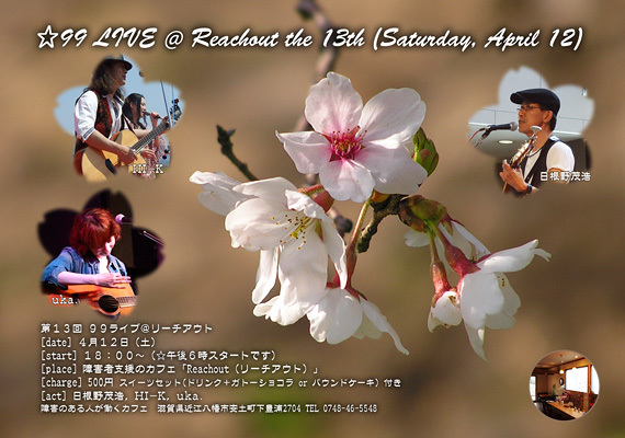 フライヤの拡大 → http://99live.jp/history/reachout_13_l.jpg ☆ 99 LIVE @ Reachout the 13th (Saturday, April 12) 「第13回 99ライブ@リーチアウト」 [date] 4月12日 (土) [start] 18:00〜(☆午後6時スタートです) [place] 障害者支援のカフェ「Reachout(リーチアウト)」 [charge] 500円 スイーツセット(ドリンク+ガトーショコラ or パウンドケーキ) 付き [act] 日根野茂浩,HI-K,uKa. Googleマップ → http://goo.gl/maps/fVQ8c 詳細は → http://99live.jp 携帯・スマホの方は → http://99p.sblo.