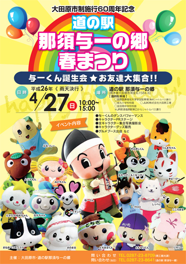 大田原市制施行60周年記念 道の駅那須与一の郷春まつり 与一くん誕生日☆お友達大集合!! http://www.nasuno-yoichi.jp/event/yoichikun2014_1.pdf 2014年4月27日(日)10時00分〜15時00分 雨天結構 道の駅那須与一の郷 http://www.nasuno-yoichi.jp/ [参加キャラクター] 18体 【タイムスケジュール】 10:00 与一くん 第一部(10:25〜11:20・8キャラクター登場) 第二部(12:00〜12:30・5キャラクター(+α)登場) 第三部(13:30〜14:20・7キャラクター登場) 14:20〜全キャラクター(集合写真撮影会) 14:45〜全