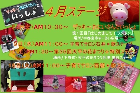 新たにスケジュールとして加わった天平の花まつり屋外ステージ 正統派でいくか異端をねらうか? ただいま検討中 はじめていく会場は何年経とうが やっぱり緊張する 天平の花まつりが行われる下野市、そして これまで平日に行ってたゆーあい広場さんの“読み聞かせ”も ガラっと変って4月〜週末土曜日の朝に切り替わるでしょ? そこもきっと 今までお会いしたことのない親子さんが来てるんだと思うし? 果たしてどの程度のお客さんがいらっしゃるのか? 年齢層はどの位か? 全然