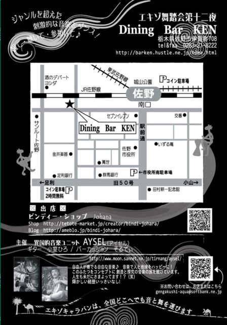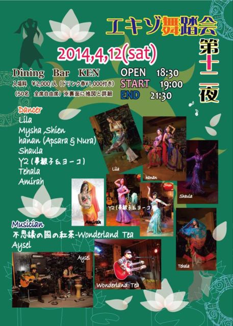 2014年エキゾ第二弾は本拠地 Dining Bar KENで開催します♪ 残念なことに3組キャンセルとなってしまいました。 追加参加と当日飛入りも受付けま〜す♪ 皆でエキゾな夜を盛り上げましょう♪ たくさんの来客をお待ちしています♪ ・・・アフリカンダンス&太鼓の飛入りあるかも・・・ ---------- 自由と平和を愛し・・音楽と踊りの旅を続けている皆様へ♪ ドアの向うには・・異国的な世界が広がっています! ... さあ あなたもご一緒に異空間でのひとときを過ごしませんか♪ 『エキゾ舞踏会【第十二夜】』 開催概要 ■日時・場所 2014