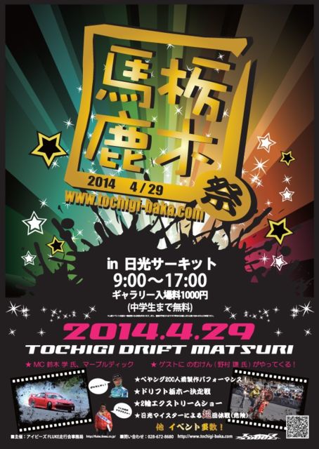 いよいよ今月開催です! 第5回TOCHIGI DRIFT MATSURI 栃木馬鹿祭り 今回のゲストも、野村謙選手ことのむけんが来場 また、ノリにノッているD1選手のうっち〜こと内海選手も来ます またMCにはおなじみマナPこと鈴木学氏です 各種ゲストによるデモ&同乗走行あり! イベント会場ではペヤング一気作成やじゃんけん大会などなど多数開催予定です! 昨年はギャラリーが800人超え!! そんな中熱い走りをしちゃいましょう〜 ぜひぜひ参加お待ちしています (参加者リストは印刷パンフレットの為