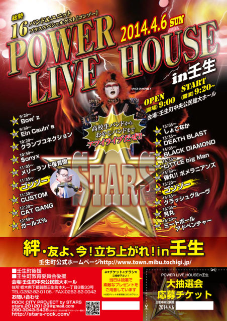 STARS企画 [POWER LIVEHOUSE in 壬生] 日時 2014.4.6(日) OPEN 9:00 START 9:20 場所 壬生町中央公民館大ホール http://eplus.jp/sys/T1U21P0423210400 この日のミートボールアドベンチャーは16:20〜のトリとなります! ぜひ 皆様おこしくださいませ! ★ミートボールアドベンチャー ★グランプコネクション ★月丸 ★Sonyx ★Bow'z ★CAT GANG ★ガールズ% ★BLACK DIAMOND ★DEATH BLAST ★弾丸!!ポメラニアンズ ★Ein Cauln's ★クラッシュグルーヴ ★LITTLE big Man ★メリーランド保育園 ★ゴンゾー ★Ex