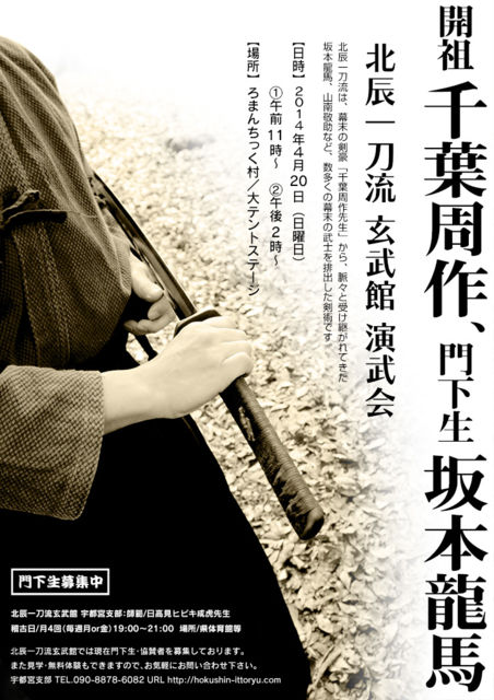 2014年4月20日(日曜日)に栃木県宇都宮市の 「ろまんちっく村」大テントステージにて演武会を行います。 演武会は午前11時〜と午後2時〜の2回を予定しています。 北辰一刀流 は、幕末の剣豪「千葉周作先生」から、脈々と受け継がれてきた 坂本龍馬、山南敬助など、数多くの幕末の武士を排出した剣術です。 入場無料ですので是非ご覧下さい^^