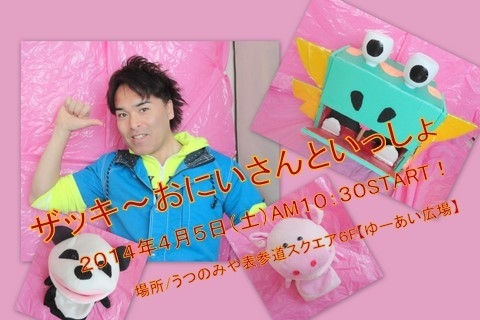 4月【ザッキ〜おにいさんといっしょ】ゆーあい広場★お知らせ 乳幼児向け 体操&歌のステージ 『おかあさんといっしょ』でお馴染みのあのメロディーや 元気いっぱい体を動かせる体操 それから子ども達の想像や創意力を膨らませる手作り小道具の登場と 学童保育の先生であり 市内保育園子育てサロンの歌のおにいさんでもある ザッキ〜おにいさんが 現代の親子に育児ヒント&癒しの時間を提供します ※入場無料