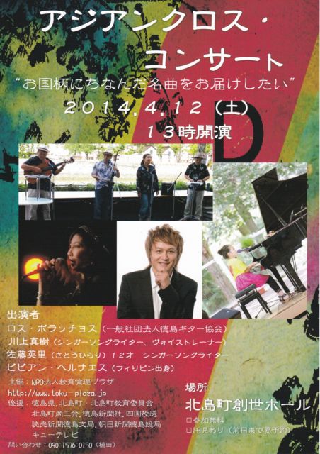 ◆04月12日(土)北島町(徳島)創世ホール ■開演 13:00 ■入場無料 ■出演 ロス・ボラッチョス (一般社団法人徳島ギター教室) ビビアン・ヘルナエス https://www.facebook.com/VivianHernaez/info 川上真樹 http://www.mackiescafe.com 佐藤英里 http://hirari.info/ ■主催 NPO法人教育倫理プラザ http://toku-plaza.jp/ ■お問合わせ 090(1576)0150[担当:植田] ■会場URL http://www.town.kitajima.lg.jp/hole/