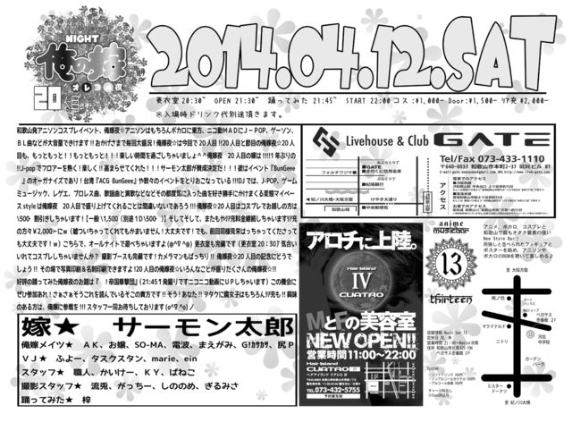 2014,4.12¡¡SAT¹¹°á¼¼20:30~¡¡OPEN 21:30~¡¡Í٤äƤߤ¿ 21:45~¡¡START 22:00~ Cosplayer:\1,000- Door:\1,500- ިޱ½¼\2,000- ¢¨Æþ¾ì»þ¥É¥ê¥ó¥¯ÂåÊÌÅÓĺ¤¤Þ¤¹¡£ ²Ç¡ú¡¡¥µ¡¼¥â¥óÂÀϺ ²¶²Ç¥á¥¤¥Ä¡ú¡¡£Á£Ë¡¢¤ª¾î¡¢SO-MA¡¢ÅÅÇÈ¡¢¤Þ¤¨¤¬¤ß¡¢G!޶޻޶޻¡¢¿¬P £Ö£Ê¡ú¡¡¤Õ¤è¡¼¡¢¥¿¥¹¥¯¥¹¥¿¥ó¹ç¶â¡¢marie¡¢ein ¥¹¥¿¥Ã¥Õ¡ú¡¡¿¦¿Í¡¢¤«¤¤¤±¡¼¡¢£Ë£Ù¡¢¤Ð¤Í¤³ »£±Æ¥¹¥¿¥Ã¥Õ¡ú¡¡Î®ÅÆ¡¢¤¬¤Ã¤Á¡¼¡¢¤·¤Î¤Î¤á¡¢¤®¤ë¤ß¤µ Í٤äƤߤ¿¡ú¡¡°´ 19¿ÍÌÜÍ٤äƤߤ¿¤Ï ¡¡¡ÚÜü!Äë¹ñ²Ú·âÃÄ¡Û Ï²λ³È¯¥¢¥Ë¥½¥ó¥³¥¹¥×¥ì¥¤¥Ù¥ó¥È¡¢²¶²ÇÌë¡ù¥¢¥Ë¥½¥ó¤Ï¤â¤Á¤í¤ó