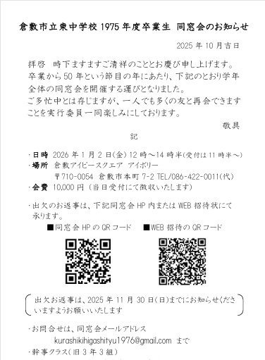 昭和35年4月〜昭和36年3月生まれ 1975年度卒業生の皆様へ 2012年に開催しました全体同窓会から早や10数年が経ち、コロナ禍に還暦を迎えた我々にとりましては、久しぶりに旧友たちとの再会を祝う時期になります。 また、本年で中学卒業後50年を迎える節目でもあります。 一人でも多くの同窓生たちにお目にかかりたいと、この度同窓会を開催するにあたり有志の方々を募って実行委員会を立ち上げました。 50周年記念同窓会実行委員長は野球部のY田くんです。 同窓会ホームページより詳細をご確認ください。 HPのURL → https://sites