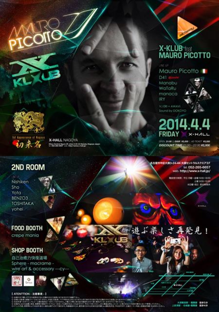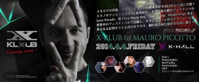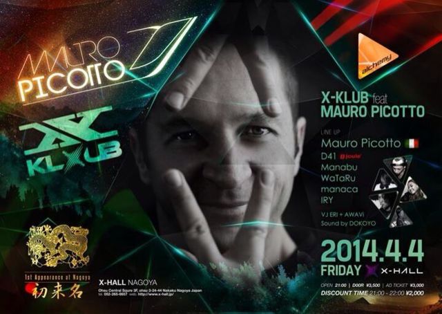 管理人様、告知失礼致します。 イタリアの英雄、マウロ・ピコット初の名古屋公演が X-KLUB にて実現!トリノ冬季オリンピックでの DJ 演奏から、世界最大級のフェスティバル Love Parade、他 Ultra Music Festival、Time Warp、Awakenings など正に世界中のフェスティバルで活躍。 トランスシーンからテクノシーンまで、多大なる影響を与えて来た真のカリスマ、名古屋初となる来日公演をお見逃し無く! 【 ☆☆ X-KLUB feat. MAURO PICOTTO ☆☆ 】 [ Date ] 2014.4.4.FRIDAY [ Venue ] X-HALL ( Nagoya, Japan ) ■ Open 21:00 -