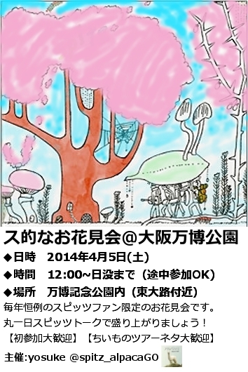 ミスチル好きの仲間同士でお花見しませんか? 今年6年目を迎える、「名古屋生チル実行委員会」が主催致します。 http://mixi.jp/view_community.pl?id=3731227 内輪ノリが少なく、女性のお一人参加の方も毎回いらっしゃって、皆さん楽しんで頂けています。 初めましての方も常連の方も、一緒に楽しみましょう\(^o^)/ ★前回のイベント(2014年1月25日)の内容・感想等はこちら http://mixi.jp/view_event.pl?comm_id=140&id=75049020 ★前々回のイベント(2013年9月28日) http://mixi.jp/view_event.pl?comm_id=140&id=73894994