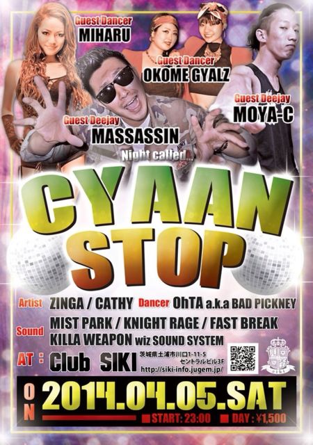 2014/4/5 sat CYAAN STOP [guest deejay] MASSASSIN MOYA-C [guest dancer] MIHARU OKOME GYALZ [artist] ZINGA CATHY [dancer] OhTA a.k.a BAD PICKNEY [sound] MIST PARK KNIGHT RAGE KILLA WEAPON wiz soundsystem start 23:00 day ¥1500 @clubSIKI 茨城県土浦市川口1-11-5 TCビル3F