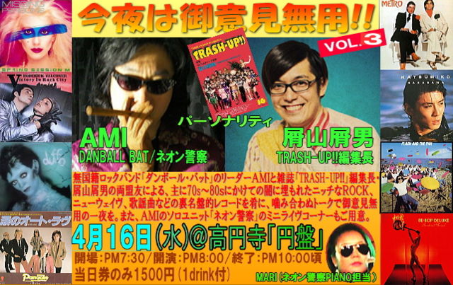 雑誌「TRASH−UP!!」編集長・屑山屑男氏と無国籍ロックバンド・ダンボール・バットのリーダー・AMIの両盟友によるマニアックでしどろもどろな音楽トーク&リスニング・イヴェントの第3弾!! 主に70年代〜80年代にかけての昭和歌謡・ニューウェイヴ・グラムロック、B級ROCK、などを中心にアノ時代のスキマに埋もれたままになっている知られざる名盤(迷盤)を発掘ご紹介するリスニング&トークイヴェントです。 AMIの闇のソロユニット「ネオン警察」のミニライヴコーナーも予定。是非!! ※当日券のみです。1500円
