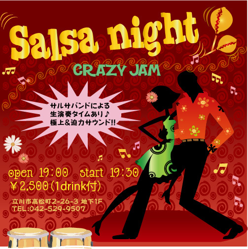 CRAZY JAM 店長 つるみです。 普段はライブハウスのこの店で、時折開催するサルサイベント、 『サルサナイト』を4月16日に開催します。 この日はテーブルを取っ払って、フロアを開放。 ダンスフロアに早変わりです。 もちろんライブハウスならでは、BGMだけでなく、大迫力の生のサルサバンドの ライブが楽しめ、その演奏に合わせて踊っていただけます! 初心者の方にも、ホストバンドのメンバーがサルサのステップをレクチャーしてくれます。 小さい店ですが、ぜひ一度贅沢な、熱いイベントを体験してください! ★ サルサ