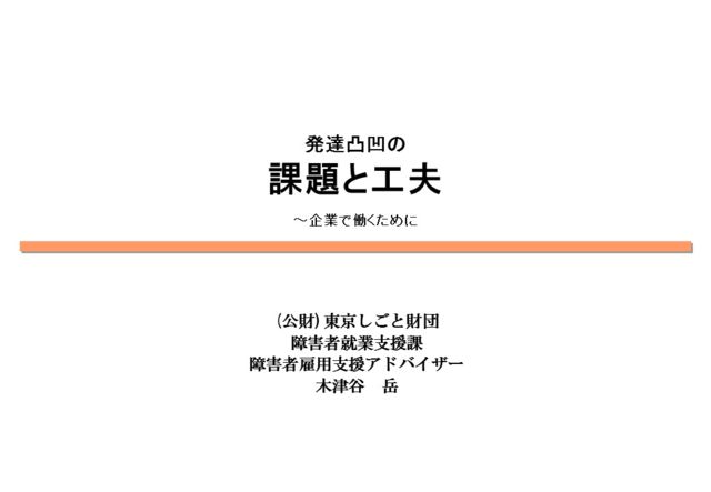 水曜勉強会「発達障害をもつ人のキャリアのつくり方」 開催日時:2014年4月16日(水) 19:30〜21:30 開催場所:Alternative Space Necco 2F (東京都新宿区西早稲田2-18-21 ハシバビル202) 参加費:無料 講師: (公財)東京しごと財団 障害者就業支援課 コーディネート事業係 障害者雇用支援アドバイザー 木津谷 岳(きづや たかし) さん 発表内容: 「発達凸凹の課題と工夫」 「採否判断のポイント」など …以下、講師の木津谷さんよりメッセージです… なにぶん私は医療関係者でも福祉の専門家でもなく、障がい者にかか