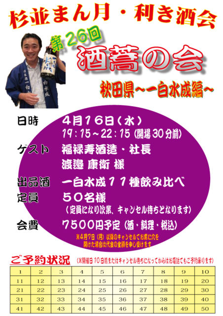 第26回目の酒蕎の会は、話題の秋田県よりNEXT5の一角、福禄寿酒造・蔵元社長「渡邉康衛」様をゲストに『一白水成』を楽しみましょう。 mixiでは、下記注意事項をご確認のうえ、ご予約下さいませ。 ★ご予約受付方法★ 現在、ご来店ご飲食されたお客様を優先してご予約受付しております。 お電話、mixiからは、 残席があれば開催日10日前(4/6〜)〜、もしくはキャンセル待ち状態になった日からキャンセル待ちにて受付させて頂きます。 ★出品酒(11種予定)★ 1.出品酒 純米大吟醸(未販売酒) 2.良心 特別