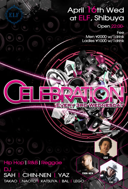 4/16 (Wed) Shibuya Club ELF 『Celebration』 昨年末まで毎週木曜日、麻布十番Villageにて開催していたCelebrationが渋谷ELFにて復活!! Hip Hop, R&B, ReggaeなどのBlack Musicを軸としたPartyです!! DJには渋谷で圧倒的な支持率を誇るDJ SAHを筆頭に、本場NYでそのスキルを評価され、帰国後も活躍を続けるDJ CHIN-NEN、これまで六本木から福生まで多種多様なクラブをロックしてきたDJ YAZの3人を筆頭としたCelebration DJsが集結。 誰もが楽しめるパーティー感を重視したHip Hop Party 『Celebration』 是非遊びに来て下さい!!!
