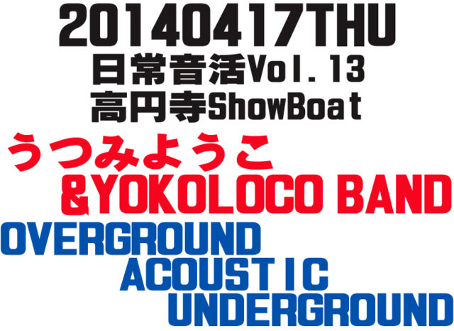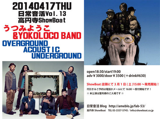 4/17(木)高円寺ショーボートにてライブが開催されます! 公演名:日常音活 Vol.13 @高円寺ショーボート 出演: うつみようこ&YOKOLOCO BAND OVERGROUND ACOUSTIC UNDERGROUND open18:30/start19:00 adv¥3000/door¥3500 日常音活Blog http://ameblo.jp/fab-53/ 前売りチケットは ShowBoat店頭にて3月1日(土)15:00〜発売開始です! 代引き&予約は同日16:00〜受付開始! 03-3337-5745 info@showboat.co.jp 詳細はショーボートHP: http://www.showboat.co.jp/pick_up/201404.html