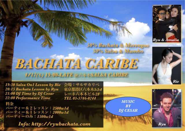 ★BACHATA CARIBE★ 六本木の人気バーサルサカリベでバチャータナイトを楽しもう、もちろんサルサ、マンボやメレンゲもたっぷりかかります!バチャータ多めのいつものDJ CESARのプレイになります。 Bachata & Merengue(50%)Salsa & Mambo(50%)の割合になります。 当日はレギューラインストラクターRieのサルサOn1レッスンプラスゲストインストラクターRyuのバチャータレッスン受けられます!今回のパフォーマンスはRyu & Amaliaのキゾンバです。皆さん是非遊びに来て下さい! ◆日時:4月17日(木)19:00-LATE ◆場所:六本木『SA