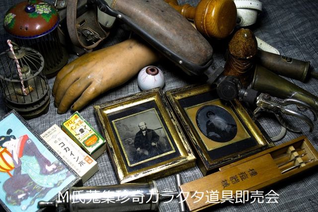 どうも、Mです。4月の17日から21日に知人の画廊カフェをお借りして、これまで僕が集めた奇妙なガラクタや古道具を展示、販売します。今となっては滅多に出会えることの無い珍品、珍本の数々を用意してお待ちしています。ぜひ遊びに来てください。 M氏蒐集珍奇ガラクタ古道具即売会目録 百鬼夜行図絵巻(幕末写)・切腹マニア蒐集男装美女切腹写真他切腹写真大量一括・昭和30年代日劇ミュージックホール他ストリップ生写真帖・伊藤晴雨肉筆緊縛画5枚・月岡芳年妖怪画・明治時代手彩色幻燈種板・幽霊画掛軸・明治期血管人体図掛軸・恩賜傷