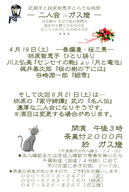 管理人さま みなさま お邪魔いたします。 桜の花が少しずつ咲き始め、日一日と空気が淡い紅色に靄がかってくるようです・・。 桜の季節は特別 という気が、毎年しています。 蕾が膨らんでゆくたびに、毎年何か、居ても立っても居られない・・というような・・ 今年の二人会4月は、ひとりで、 3つの桜景色を朗読してみたいと思っております。 スペシャルゲストに来て頂けるよう・・お願いしてもおります。 どうぞ、春の午後のひとときを、物語のなかの花景色でお楽しみください。 日時 4月19日(土) 15時から 場所 カフェガス燈