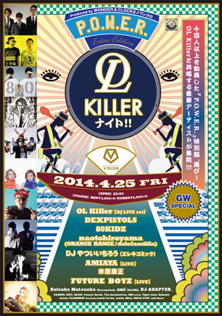 こちらのイベントにご興味ある方、遊びに来られる方は お得な予約リストを受付ておりますので 代表者の方のお名前カタカナフルネームと参加者様の 人数をご連絡ください★ 以下、イベント詳細です! ------------------------------------------------------------ OPEN 23:00 \3000 (1D) LADIES \3500 (1D) MENS VISION member \500 off 100人以上を動員した『P.O.W.E.R.』特別編、再び!!OL Killerと共鳴する豪華アーティストが集結した『OL Killer ナイト!!』第二弾、この春開催!!