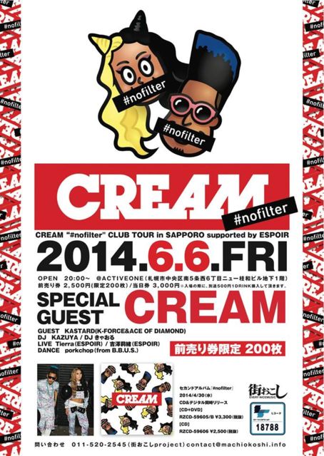 管理人様、告知失礼致します。 CREAM - #nofilter https://www.youtube.com/watch?v=fK0QH-jRKn4 昨年の道内ツアーでも、総動員数約1,200名を集め、その話題性とファッション性、なによりも、この二人の奏でる楽曲、LIVEパフォーマンスに人気を集め 各会場爆発的な盛り上がりを見せ…2014年4月30日待望のNEW ALBUM ”#nofilter”を発売するCREAMが再び、北海道に”超”上陸。 今回札幌会場は、CREAMとお客様の距離を考慮し、会場を札幌@ACTIVEONEに移し、そのステージとフロアの距離の近さで、二人の一つ一つの動き、熱さを感じて、