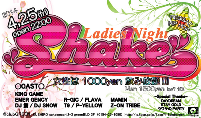 ♪REGGAE/HIP HOP <4/25(fri) OPEN 22:00> 【Shake】 **CAST** ◯MUSIC◯ KING GAME DJ SNOW DJ 鯖(ウワサのparty) EMER GENCY ◯MIC◯ R-GIC FLAVA P-YELLOW(ウワサのparty) T9(DAYDREAM) ◯DANCE◯ Z-ON TRIBE MAMIN [MEN 1500yen(1D)] [Ladies 1000yen(FreeDrink)]