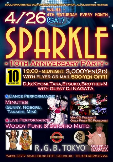 4/26(Sat)SPARKLE Vol.93 10th Anniversary¡÷R.G.B TOKYO Ëè·îÂ裴ÅÚÍ˳«ºÅ¤ÎSPARKLE!!! º£²ó¤Ï³§¤µ¤Þ¤Î¤ª¤«¤²¤ò¤â¤Á¤Þ¤·¤Æ ¡¡¡¡ÀáÌܤÎ10¼þǯµÇ°PARTY¤È¤µ¤»¤ÆÄº¤¤Þ¤¹ Àè²ó3/22(Sat)¤ÎSPARKLE¤ÏGuest Dj¤ËDj ICE¤ò¤ª·Þ¤¨¤·¤Æ¤ªÆÀ°Õ¤Î ¡¡¡¡NewJackSwing¤ò¸ò¤¨Âô»³¤Î¤ªµÒ¤µ¤Þ¤Ë¤´Íè¾ìĺ¤¤Þ¤·¤Æ´¶¼Õ¤Ç¤·¤¿ Guest D£ê¤Ë¤Ï5/11¤Ë40¼þǯµÇ°PARTY¤ò³«ºÅ¤µ¤ì¤ë¤ªÆëÀ÷¤ß²£ÉÍ ¡¡¡¡¥ì¥¸¥§¥ó¥É¤ÎDj NAGATA·»¤ò¤ª·Þ¤¨¤·¤Æ¤ªÂ£¤êÃפ·¤Þ¤¹ Live