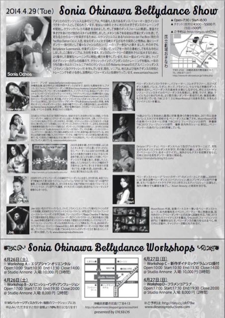 SONIA OCHOA IN OKINAWA SHOW! 2014ǯ4·î29Æü¡Ê²Ð¡Ë@ ¹ñΩ·à¾ì¤ª¤¤Ê¤ï http://www.nt-okinawa.or.jp/index.php?option=com_content&task=view&id=36&Itemid=42 ³«¾ì – 17:30 ³«±é – 18:30 ¥Á¥±¥Ã¥È¡§(Á°Çä¤ê) 4,500 – 5,500 ±ß (ÅöÆü) +500±ß °ìÉô¤ò½ü¤¡¢»ØÄêÀʤȤʤäƤª¤ê¤Þ¤¹¡£ Îɤ¤¤ªÀʤϡ¢¤ªÁá¤á¤Ë¤ªÇ㤤µá¤á¤¯¤À¤µ¤¤¡ª ¥¹¥Ú¥·¥ã¥ë¥²¥¹¥È¥À¥ó¥µ¡¼¡§Shaw Anze, Mika, Leo, Moon Roses, Sugako Ishikawa, ΰµåBellyDance Priscilla, Tazuko, Delyce, Tomoka (MaccuPiccu Bellydance Club), Pearl