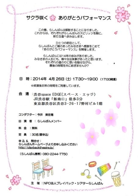 ¤³¤Î½Õ¡¢NPOË¡¿Í¥×¥ì¥¤¥Ð¥Ã¥¯¡¦¥·¥¢¥¿¡¼¤é¤·¤ó¤Ð¤ó¤Ï²ò»¶¤¹¤ë¤³¤È ¤Ë¤Ê¤ê¤Þ¤·¤¿¡£¤³¤ì¤«¤é¤Ï¡¢¤½¤ì¤¾¤ì¤¬¤é¤·¤ó¤Ð¤ó¤Î¥¹¥Ô¥ê¥Ã¥Ä¤ò¶»¤Ë¡¢ ¿·¤¿¤ÊÆ»¤ØÊâ¤ß½Ð¤·¤Þ¤¹¡£¤Ò¤È¤Ä¤ÎÀáÌܤȤ·¤Æ¡¢¤é¤·¤ó¤Ð¤ó¤È¤´±ï¤Î ¤¢¤Ã¤¿¤ß¤Ê¤µ¤Þ¤Ø´¶¼Õ¤ò¤³¤á¤Æ¡Ö¤¢¤ê¤¬¤È¤¦¥Ñ¥Õ¥©¡¼¥Þ¥ó¥¹¡×¤ò³«ºÅ ¤·¤Þ¤¹¡£¤é¤·¤ó¤Ð¤ó¤Ë¤Ï14ǯ¤ÎÊâ¤ß¤¬¤¢¤ê¤Þ¤·¤¿¡£ ¤ß¤Ê¤µ¤Þ¤Î¿ÍÀ¸¤Ë¤â¡¢ÍÍ¡¹¤Ê½ÐÍè»ö¤¬¤¢¤Ã¤¿¤È»×¤¤¤Þ¤¹¡£ ¤½¤ì¤¾¤ì¤ÎÆ»¤Î¤ê¤ËÁÛ¤¤¤òÃÚ¤»¤Ê¤¬¤é¡¢ºÇ¸å¤Î»þ´Ö¤ò¶¦¤Ëˤ®¤Þ¤»¤ó¤«? ¢£ÆüÄø¡§2014ǯ4·î26Æü(ÅÚ)¡¡ 17:30¡Á19:00 ¡Ê17:00³«¾ì¡Ë ¡¡¡¡¡¡¡¡¡¡½ª±é¸å¤ªÃã¤Î»þ´Ö¤ò