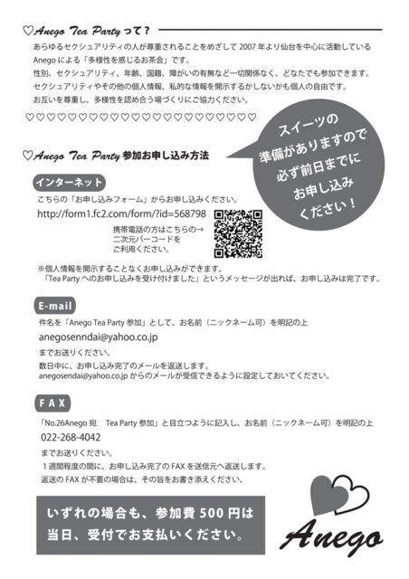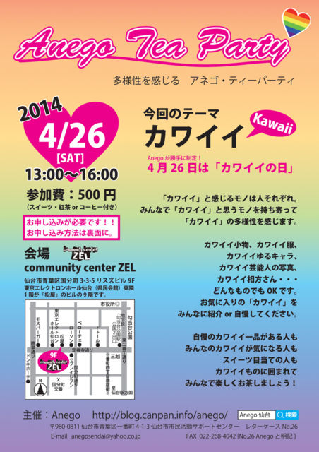 ¿ÍÍÀ¤ò´¶¤¸¤ëAnego Tea Party ¢£Æü»þ¢£ 4/26(ÅÚ)13:00-16:00 ¢¨±©À¸·ë¸¹Áª¼ê¶â¥á¥À¥ë¥Ñ¥ì¡¼¥É¤Î´Ñ¾Þ»þ´Ö¤ò´Þ¤ß¤Þ¤¹¡£ ¢£²ñ¾ì¢£ community center ZEL ÀçÂæ»ÔÀÄÍÕ¶è¹ñʬĮ3-3-5¥ê¥¹¥º¥Ó¥ë9³¬ ¢£»²²ÃÈñ¢£ 500±ß¡Ê¥¹¥¤¡¼¥Ä¡¢¹ÈÃãor¥³¡¼¥Ò¡¼ÉÕ¤¡Ë ¢£¤ª¿½¹þ¤ß¢£ ¥»¥¯¥·¥å¥¢¥ê¥Æ¥£¡¦¥Õ¥ê¡¼¡Ê¤É¤Ê¤¿¤Ç¤â»²²Ã¤Ç¤¤Þ¤¹¡Ë ¤ª¿½¹þ¤ß¤Ï¤³¤Á¤é¤«¤é¢ http://form1.fc2.com/form/?id=568798 ¡Ê¥¹¥¤¡¼¥Ä¤Î½àÈ÷¤¬¤¢¤ê¤Þ¤¹¤Î¤ÇÁ°Æü¤Þ¤Ç¤Ë¤ª¿½¤·¹þ¤ß¤¯¤À¤µ¤¤¡Ë º£²ó¤Î¥Æ¡¼¥Þ¤Ï¡Ö¥«¥ï¥¤¥¤¡×¤Ç¤¹¡£ ¡Ö¥«¥ï¥¤¥¤¡×¤È´¶¤¸¤ë¥â¥Î¤Ï¿Í¤½¤ì¤¾¤ì¡£ ¤ß¤ó¤Ê¤Ç¡Ö