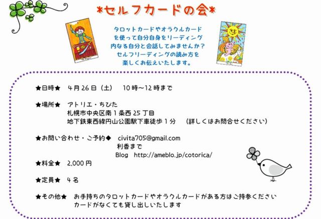 ¥¢¥È¥ê¥¨¡¦¤Á¤Ó¤¿¤Ç¥»¥ë¥Õ¥«¡¼¥É¤Î²ñ¢ö ¥¿¥í¥Ã¥È¥«¡¼¥É¤ä¥ª¥é¥¯¥ë¥«¡¼¥É ¤ò»È¤Ã¤Æ¼«Ê¬¼«¿È¤ò¥ê¡¼¥Ç¥£¥ó¥° Æâ¤Ê¤ë¼«Ê¬¤È²ñÏ䷤Ƥߤޤ»¤ó¤«¡© ʹ¤¤¤Æ¤ß¤¿¤¤¤Û¤ó¤È¤¦¤Î¼«Ê¬¤ÎËܲ»^^ ¥«¡¼¥É¤òÄ̤¸¤Æ¤â¤Ã¤È¼«Ê¬¤ÈÃçÎɤ¯¤Ê¤ê¤Þ¤·¤ç¤¦¡£ Æñ¤·¤¯¤Ï¤¢¤ê¤Þ¤»¤ó¤Î¤Çµ¤³Ú¤Ë¤´»²²Ã¤¯¤À¤µ¤¤¡£ ¥»¥ë¥Õ¥ê¡¼¥Ç¥£¥ó¥°¤ÎÆÉ¤ßÊý¤ò ³Ú¤·¤¯¤ªÅÁ¤¨¤¤¤¿¤·¤Þ¤¹¡£ Æü»þ¡¡£´·î£²£¶Æü¡ÊÅÚ¡Ë10¡Á£±£²»þ¤Þ¤Ç ¾ì½ê¡¡¥¢¥È¥ê¥¨¡¦¤Á¤Ó¤¿¡¡ ¡¡¡¡¡¡¡¡»¥ËÚ»ÔÃæ±û¶èÆî1¾òÀ¾25ÃúÌÜ ¡¡¡¡¡¡¡¡Ãϲ¼Å´ÅìÀ¾Àþ¡¡±ß»³¸ø±à±Ø¤¹¤° Äê°÷¡¡£´Ì¾ ÎÁ¶â¡¡2000±ß¡¡¤ªÃã²Û»Ò¤Ä¤ ¤ªÌä