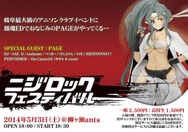 テレビアニメ銀魂のEDでおなじみ「PAGE」をゲストにお出迎え!! GWはニジロックフェスティバル!柳ヶ瀬antsに集まれ!! ▼ 開催日 ▼ 2014年5月3日(土) ▼ 時間 ▼ OPEN 18:00 (START 18:30) ↓ CLOSE 24:00 (高校生は22:00までとなっております) ▼ 入場料 ▼ 一般 2,500円 高校生 1,500円 (入場の際、別途ドリンク代500円が必要です) コスプレ mixiコミュニティ参加表明 Tweetvite参加表明 のいずれかで500円OFF!! 参加表明の締め切りは前日23:59まで。 割引サービスの併用はできません。 詳しくはこ