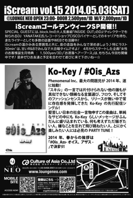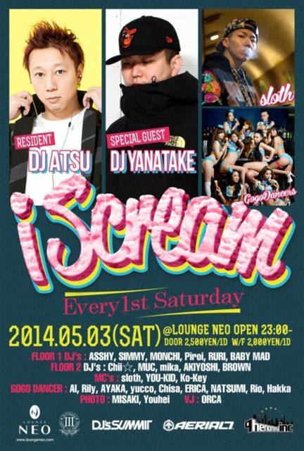 2014.05.03(SAT) iScream vol.14 @LOUNGE NEO OPEN 23:00〜 DOOR 2,500yen/1D W/F 2,000yen/1D エントランスにて【ミカのゲストでアイスクリーム】と伝えて頂くと、、、 1500円/1Dにディスカウントです★是非ご利用下さい♫ ※個別ゲストも取れますので、気軽にお問い合わせ下さい♡ iScreamゴールデンウィークSP開催!! SPECIAL GUESTには、block.fmの大人気番組「INSIDE OUT」のDJ/ディレクターでも知られるDJ YANATAKE氏! レコードショップCISCOバイヤーとしてのキャリアも持ち、またライターとしても多数の