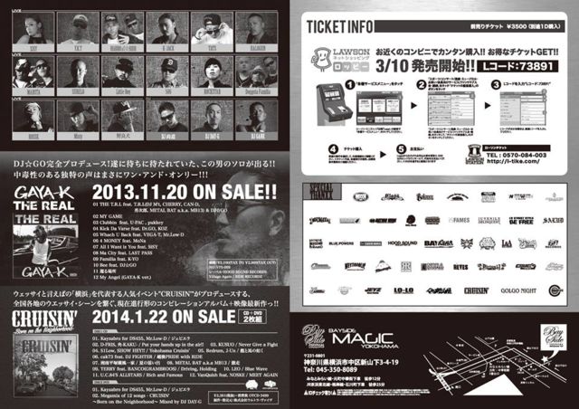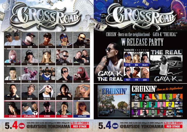 CROSS ROAD ¥í¡¼¥½¥ó¥Á¥±¥Ã¥È L¥³¡¼¥É 73891 3·î10Æü¤«¤é¥Á¥±¥Ã¥ÈÈÎÇä¡£ ¡ùCRUISIN¡Ç -Born on the neighborhood- ¡ùGAYA-K ''THE REAL'' W RELEASE PARTY¡ª¡ª¡ª 5·î4Æü ÆüÍËÆü @BAYSIDE YOKOHAMA(Red Stage)go 14:00 OPEN / 22:00 CLOSE ¥í¡¼¥½¥ó¥Á¥±¥Ã¥È L¥³¡¼¥É : 73891 ÅöÆü 4000yen/1D Á°Çä¤ê 3500yen/1D LIVE DS455 / BIG RON / U-PAC DJ¡ùGO / EL LATINO / »í²» Mr.Low-D / MoNa / GIPPER / II-DOGG t-Ace / S.T.M / 81TC / VEGA-T T.O.P / ÂçÃÏ / KOWICHI / Niyke Rovinz MUROZO / pukkey / SISY / Y.K.T