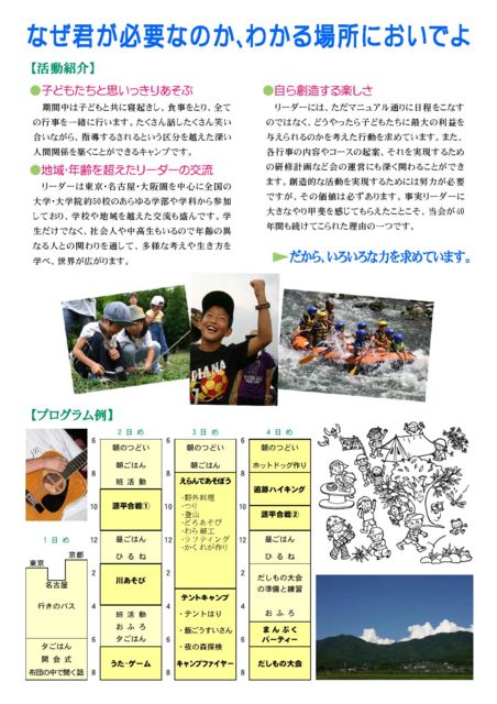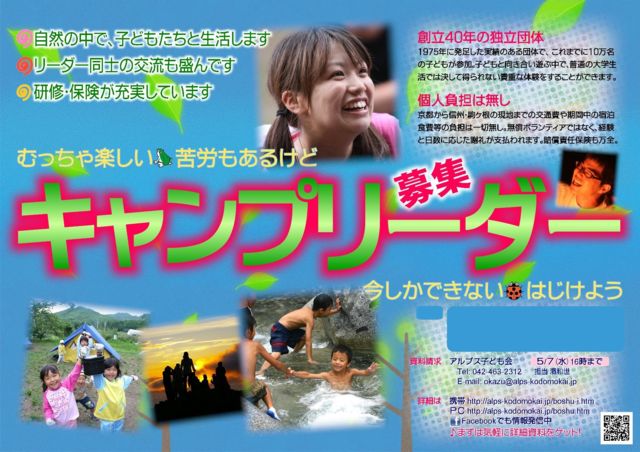 ĹÌ¶ð¥öº¬¤Ë³èưµòÅÀ¤òÃÖ¤¯¥¥ã¥ó¥×ÃÄÂÎ¥¢¥ë¥×¥¹»Ò¤É¤â²ñ¤Ç¤Ï¿·Ç¯Å٤ˤ¢¤¿¤ê¡¢³ØÀ¸¥¥ã¥ó¥×¥ê¡¼¥À¡¼¤òÊ罸¤·¤Þ¤¹¡£ ¥¢¥ë¥×¥¹»Ò¤É¤â²ñ¤Ï1975ǯ¤Ëȯ¤·¤¿¼ÂÀÓ¤¢¤ëÃÄÂΤǤ¹¡£¤³¤ì¤Þ¤Ç¤Ë10Ëü¿Í°Ê¾å¤Î»Ò¤É¤â¤¬»²²Ã¤·¡¢ÉáÄ̤ÎÂç³ØÀ¸³è¤Ç¤Ï·è¤·¤ÆÆÀ¤é¤ì¤Ê¤¤µ®½Å¤ÊÂ賤¬¤Ç¤¤Þ¤¹¡£ ¸òÄÌÈñÅù¤ÎÉéô¤Ï¤¢¤ê¤Þ¤»¤ó¡£Ìµ½þ¥Ü¥é¥ó¥Æ¥£¥¢¤Ç¤Ï¤Ê¤¯¡¢·Ð¸³¤ÈÆü¿ô¤Ë±þ¤¸¤¿¼ÕÎ餬½Ð¤Þ¤¹¡£Çå½þÀÕǤÊݸ±¤âËüÁ´¤Ç¤¹¡£ »ñÎÁÀÁµá ¢ª¥¢¥ë¥×¥¹»Ò¤É¤â²ñ 5·î7Æü16»þ¤Þ¤Ç TELL:042-463-2312 Email:okazu@alps-kodomokai.jp ôÅö:ßÀÏÂÀ¤ ¾ÜºÙ ¢ª PC:http