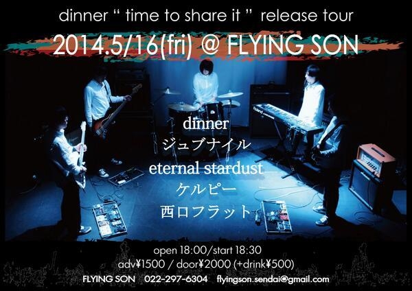 『dinner “time to share it” release tour』 2014.5.16(金)仙台フライングサン open/18:00 start/18:30 ticket 当日2,000円 前売1,500円 -Act- dinner 西口フラット ジュブナイル eternal stardust ケルピー and more…