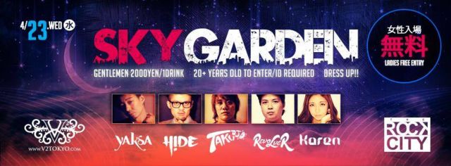 管理人様告知失礼致します。 2014.5.28 (Wed) "SKY GARDEN" @ V2 TOKYO [OPEN] 22:00 [ゲスト料金] M \2000/1D W FREE/1D ★DJ TAKU(タク)のゲストで来ました★と入口で伝えてもらえれば上記のゲスト料金で何名様でも入場可能です [DJ] YAKSA,HIDE,TAKU