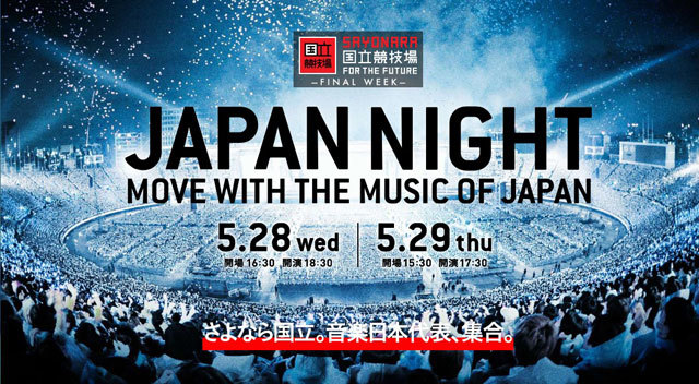 2014年5月31日にその長い歴史の幕を閉じる国立競技場。 ファイナルウィークの5月28日、29日に行なわれる最後の音楽イベント 「SAYONARA国立競技場 FINAL WEEK JAPAN NIGHT」 http://www.japannight.jp/ 5月28日(水)の『Yell for Japan』に応募したチケットが当選したので 行きたい方がいればご一緒しませんか? 席はアリーナ席の13列です。感じ的に一番前のブロックのややセンター上手かな かなり良番だと思います。直に話ができる距離です。 (予定参加者に達しました。) 出演 いきものがかり、ウカスカジー(桜井和寿&GAKU-MC)、岸谷