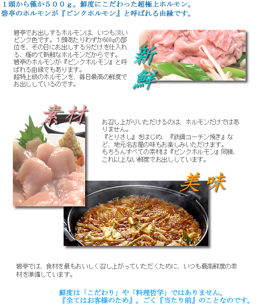 管理人の甚三郎です。 予約確定しました。下記のようにオフ会を開催します。 日時:2014-5-28 (水)19:30〜 場所:旬鮮馳走 碧亭 ぐるなびのページ: http://r.gnavi.co.jp/n081700/ 〒460-0008 愛知県名古屋市中区栄1-10-11 鏡園ビル1F 地下鉄 伏見駅 6番出口 徒歩2分 http://www.hekitei.com/top.html 鉄鍋ホルモン焼 ご宴会コース (飲み放題 120分間) ☆名物!鉄鍋ホルモン焼 食べ放題・飲み放題 ≪コース内容≫ 1.塩ゆで落花生 2.ざる豆腐 3.魚のマリネ 4.季節のサラダ