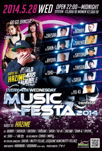管理人様告知失礼します。 エントランスで、 ★★★★★★★★★★★★★★★★★★★★★★★ 「タイスケのゲストでフェスタ」 ★★★★★★★★★★★★★★★★★★★★★★★ と言って頂ければ、何名様でもゲスト料金でご入場頂けます。 男性2000YEN/1D 女性1500YEN/1D のゲスト料金です。 また個別にでもゲストお取りできますので、メッセージください。 宜しくお願いします。 5/28(水)「MUSIC FESTA」@渋谷camelot OPEN:22:00 CLOSE:5:00 GUEST DJ: HAZIME DJ: