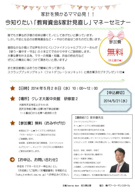 ¤³¤Î¤¿¤Ó¡¢¥¯¥ì¥ªÂçºåÃæ±û¤Ë¤Æ ¼çºÅ¡§¤µ¤¯¤¤ß¡¢¶¨ÎÏ¡¨ê¥Ñ¥ï¡¼¥¦¡¼¥Þ¥ó¥¹¥¿¥¤¥ëÍÍ¤Ç ¡Ö²È·×¤òͤ«¤ë¥Þ¥Þɬ¸«¡ª¡ªº£ÃΤꤿ¤¤¡Ö¶µ°é»ñ¶â&²È·×¸«Ä¾¤·¡×¥Þ¥Í¡¼¥»¥ß¥Ê¡¼¡Ê¥×¥Á¥×¥ì¥¼¥ó¥ÈÉÕ¤¡ú¡Ë¡×¤ò³«ºÅ¤·¤Þ¤¹¡ª »²²ÃÈñ̵ÎÁ¡ª¥¹¥¯¥é¥Ã¥×¥Ö¥Ã¥¥ó¥°¥¥Ã¥È¡¦¾Æ¤²Û»Ò¤Î¤ªÅÚ»ºÉÕ¤¤Î¤ªÆÀ¤Ê¥»¥ß¥Ê¡¼¤Ç¤¹¡ú ¤Ê¤«¤Ê¤«Ê¹¤¯µ¡²ñ¤Î¤Ê¤¤¡¢»Ò¤É¤â¤Î¶µ°é»ñ¶â¡¢²È·×¤Î¸«Ä¾¤·¡£¡£ ¤ß¤ó¤Ê¤É¤¦¤·¤Æ¤ë¤Î¡©¤ß¤ó¤Ê¤É¤ó¤Ê¤Õ¤¦¤Ë¹Í¤¨¤Æ¤ë¤Î¡© ¤¶¤Ã¤¯¤ê¤Ç¤·¤«»×¤¤ÉÁ¤±¤Æ¤¤¤Ê¤¤¤Ê¤¡¡£¡£¡£ »Ò¤É¤â¤ÎÌ´¤ò¤«¤Ê¤¨¤ë¤¿¤á¡£ ²È²¤ÎÌ´¤ò¤«¤Ê¤¨¤ë¤¿¤á¡£ ¾¯¤·¤ª¶â